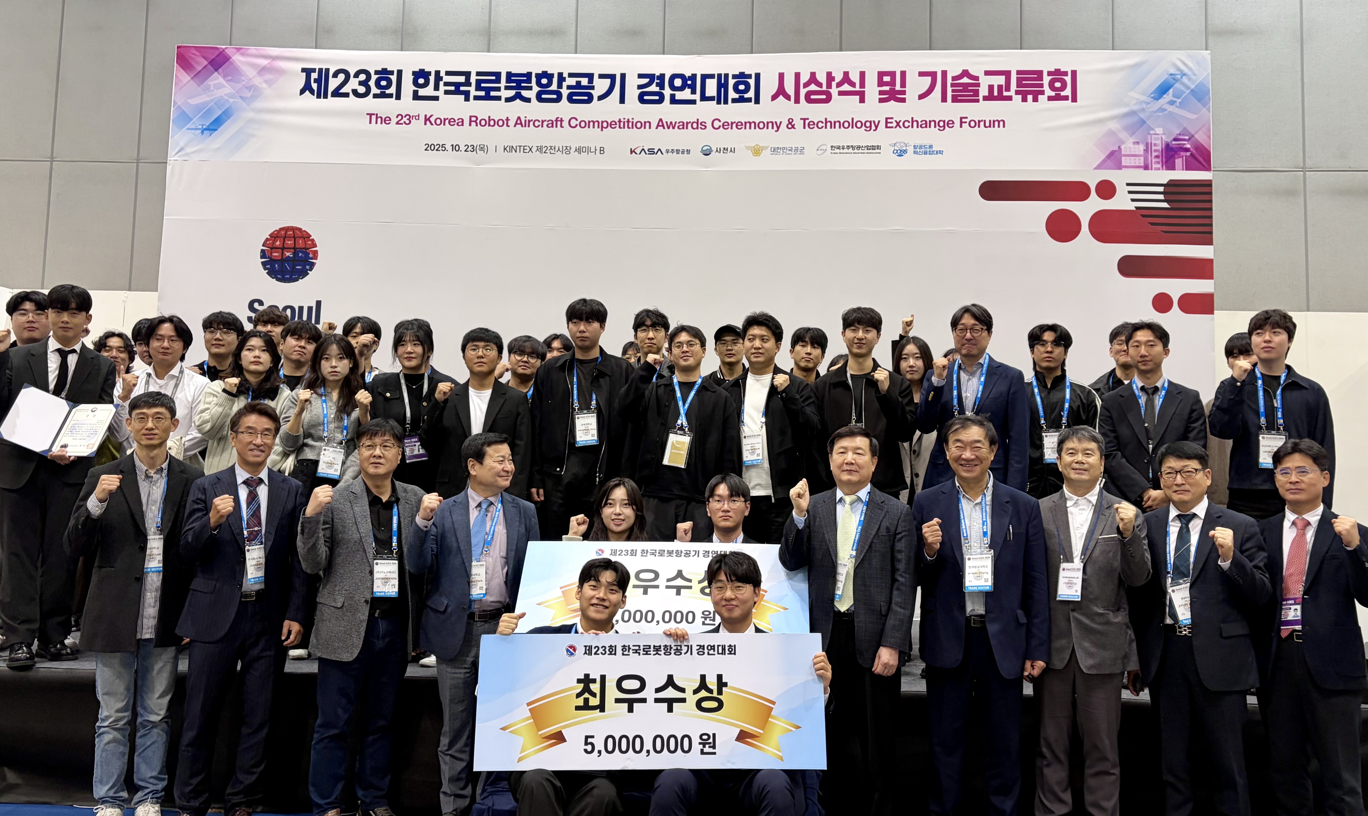한국우주항공산업협회, 제23회 한국로봇항공기 경연대회 시상식 및 기술교류회 개최 - 우주항공협회는 ADEX 2025에서 2025년 9월 사천에서 개최된 제23회 한국로봇항공기 경연대회(AAM Tech Challenge) 시상식을 진행 - 이날 시상식에서는 수상팀의 기술교류 발표가 함께 진행, 참가팀들의 창의적인 항공기 설계와 자율비행 기술을 공유하는 자리가 마련, 최우수상은 한서대학교 HACUS팀과 연세대학교 연세드론팀이, 우수상은 부산대학교 PNUAV팀과 건국대학교 ASEC팀이 수상