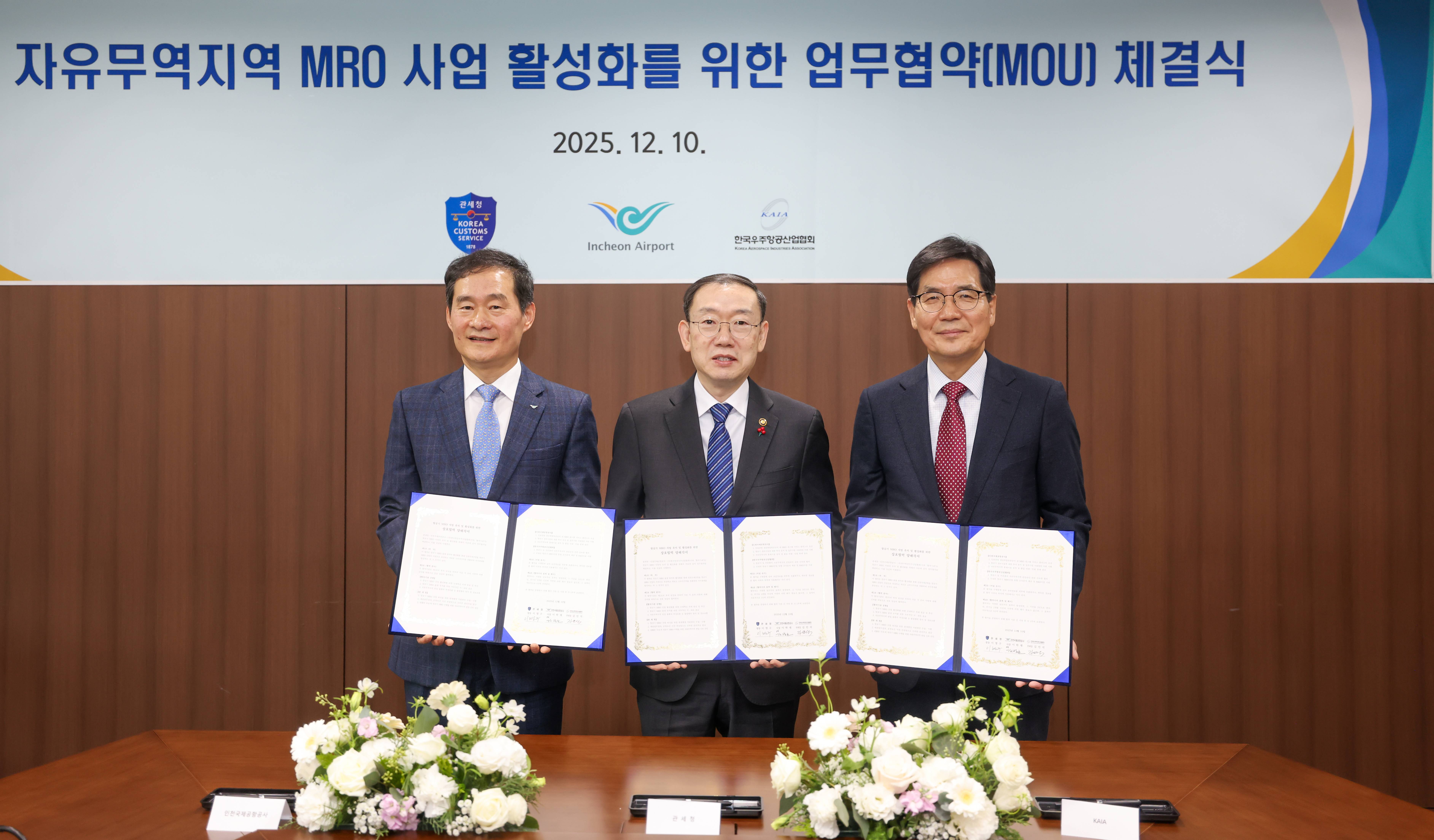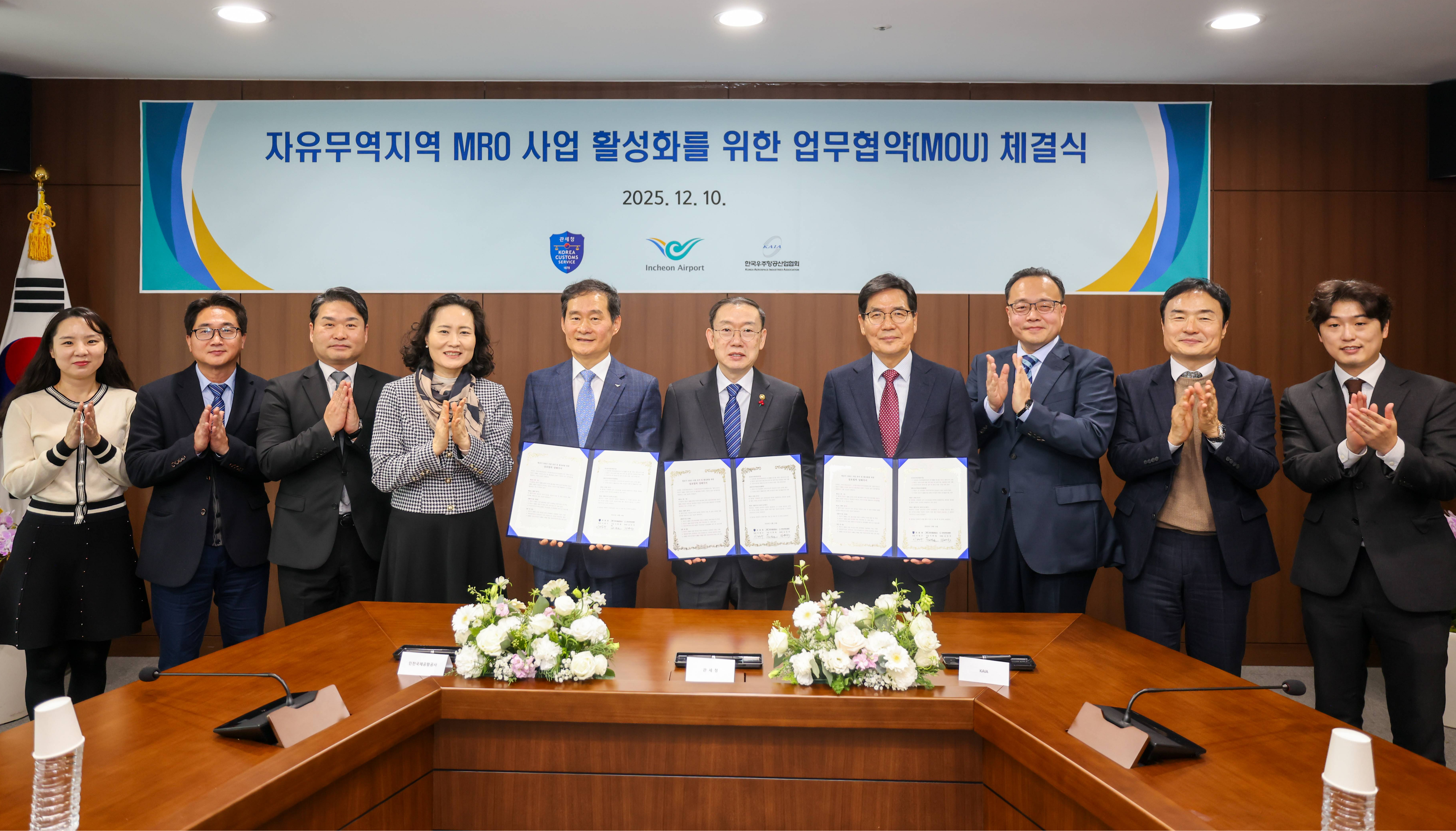 - 한국우주항공산업협회는 관세청, 인천국제공항공사와 12월 10일 인천공항공사 임원회의실에서 ‘항공기 MRO 사업 유치 및 활성화를 위한 업무협약(MOU)’을 체결 - 이번 협약은 국가 신성장동력으로 주목받는 항공기 MRO 산업의 체계적인 육성과 글로벌 시장 선점을 위한 민․관 협력 기반을 강화하기 위해 추진, 이날 협약식에는 김민석 우주항공협회 부회장, 이명구 관세청장, 김범호 인천공항공사 부사장을 비롯한 체결기관 관계자들이 참석 - 세 기관은 이번 협약을 통해 △항공기 MRO 산업 활성화를 위한 규제혁신 과제 발굴 및 추진 △항공기 MRO 물량 유치를 위한 국내외 홍보 △자유무역지역 반입 물품의 부정 유출 등 불법행위 방지 및 정보 공유 등에 대해 상호 협력해 나가기로 함