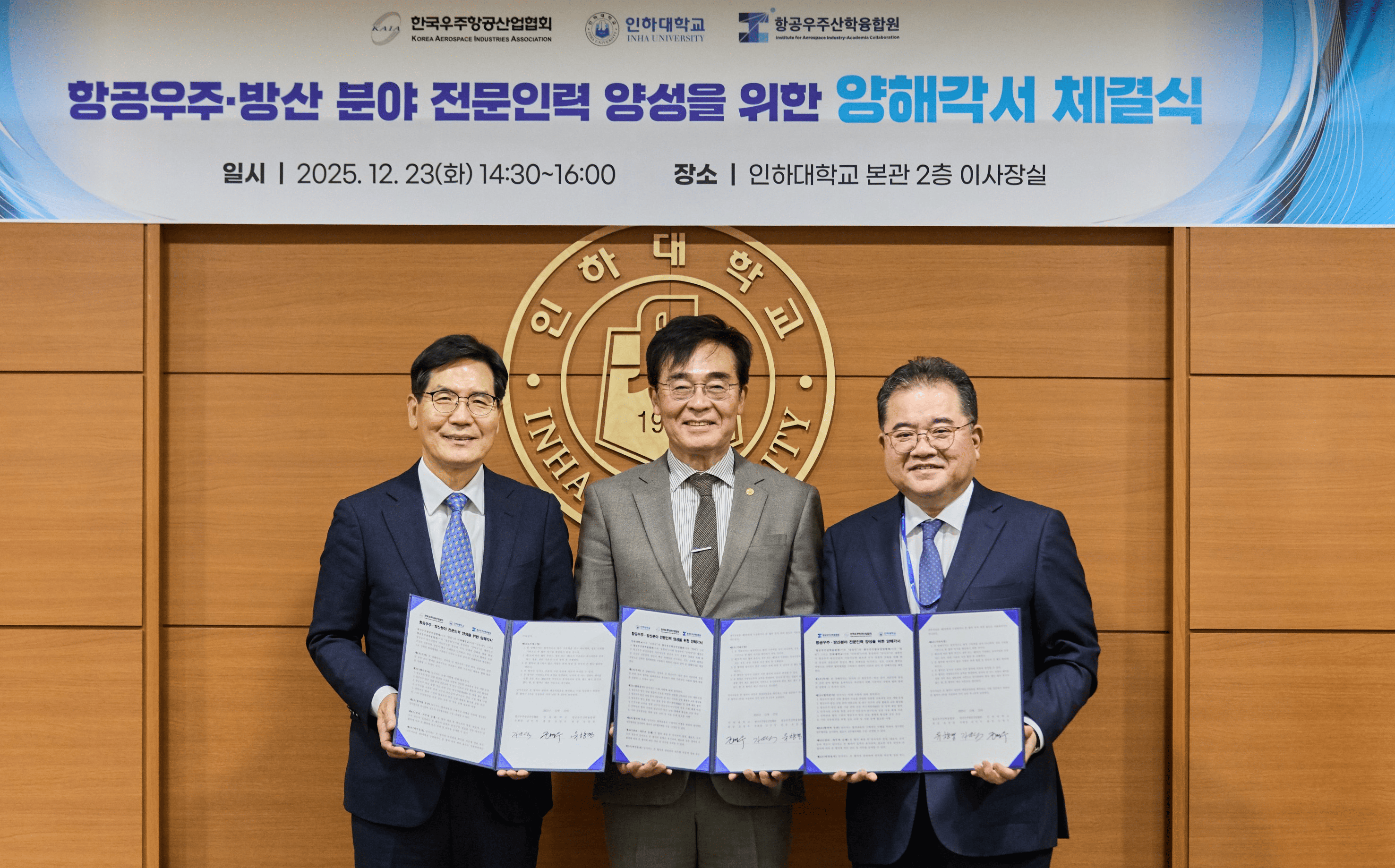 한국우주항공산업협회-인하대학교-항공우주산학융합원, 항공우주·방산분야 전문인력 양성을 위한 양해각서 체결 - 한국우주항공산업협회, 인하대학교, 항공우주산학융합원은 12월 23일 ‘항공우주·방산분야 전문인력 양성을 위한 양해각서’를 체결 - 세 기관은 이번 양해각서를 통해 △항공우주·방산 산업 현장의 수요를 반영한 맞춤형 교육과정 공동 개발·운영 △전문교육 및 연구 인프라 공동 활용과 교류 활성화 △공동 연구개발(R&D) 및 정책 제안 협력 등을 위해 상호 협력할 예정