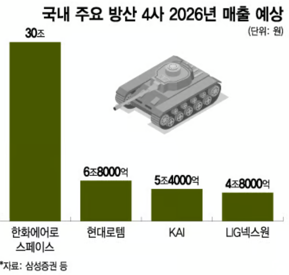 - 국내 주요 방산 4사(한국항공우주(KAI)·한화에어로스페이스·LIG넥스원·현대로템)의 2026년 예상 합산 매출은 약 47조원으로 추정- KAI는 차세대 전투기인 KF-21의 수출을 둘러싸고 인도네시아, UAE 등에서 관심을 표하며 의미 있는 진전이 있을 것으로 기대, 한화에어로스페이스는 K9 자주포 128문을 스페인에 제안하였으며, 현대로템과 LIG넥스원 또한 각각 수출 비중 확대를 기대